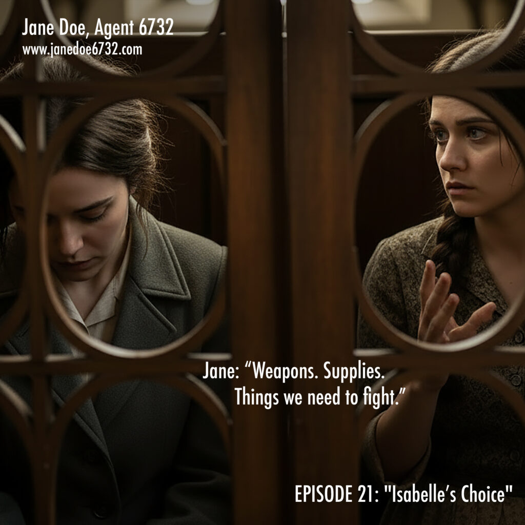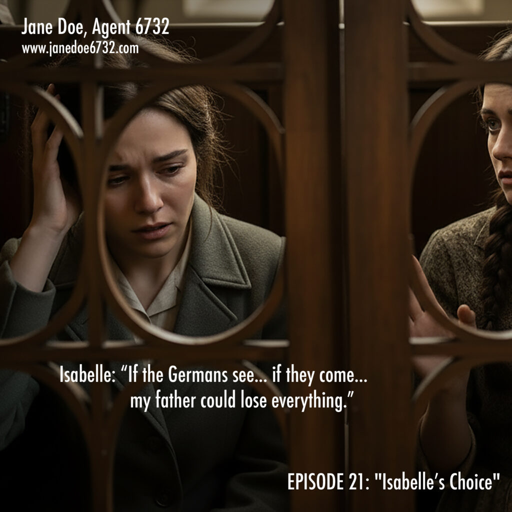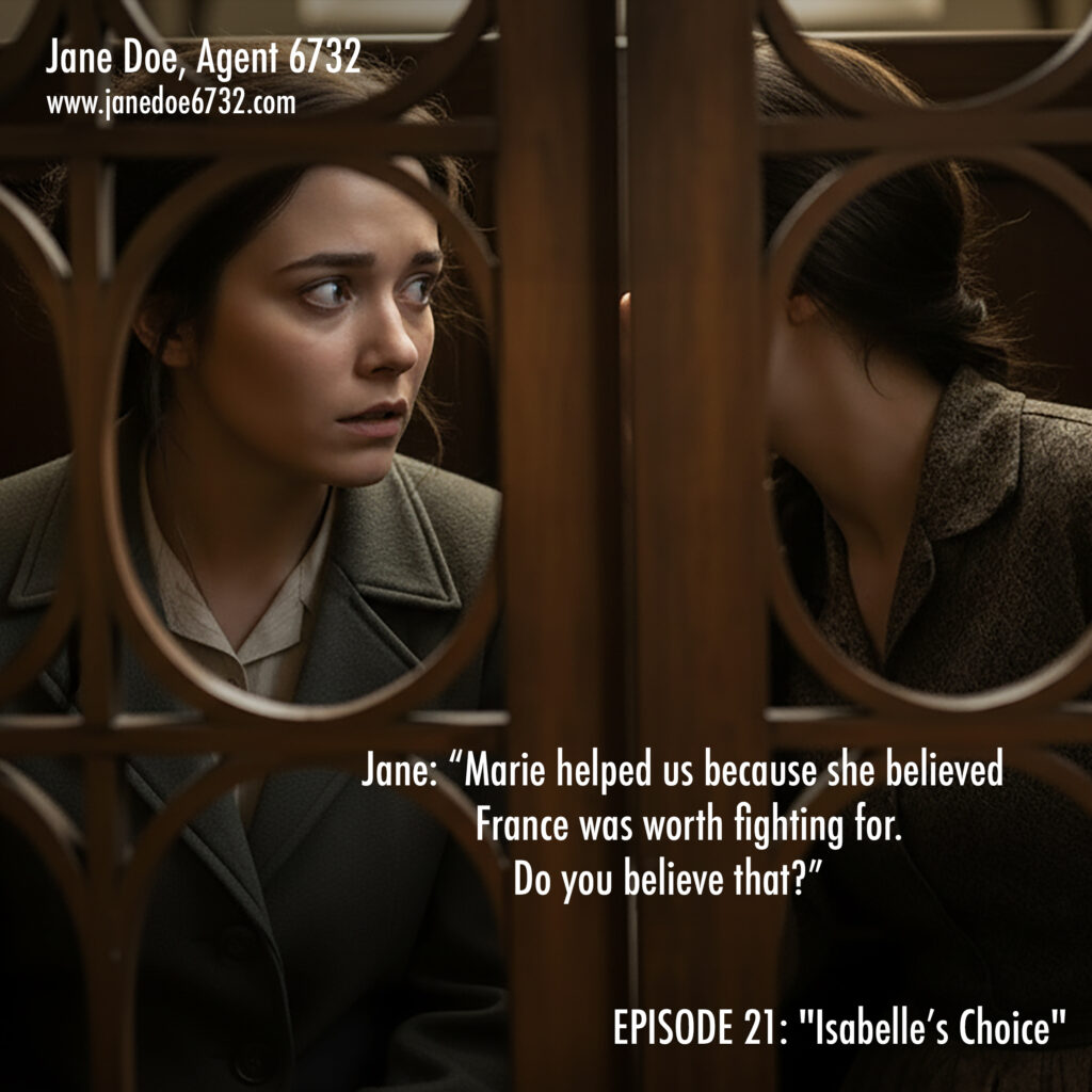 January 4, 2026 | No Comments Isabelle Mercier. 17. Chooses resistance over safety. The network grows. #JaneDoe6732 #SaintMartin #Confession #WWIIFiction #GraphicNovel Tags: GraphicNovel, Jane Doe, Jane Doe Program, JaneDoe6732, OSS, Saint-Martin, SOE, Spy Thriller, WWII Fiction